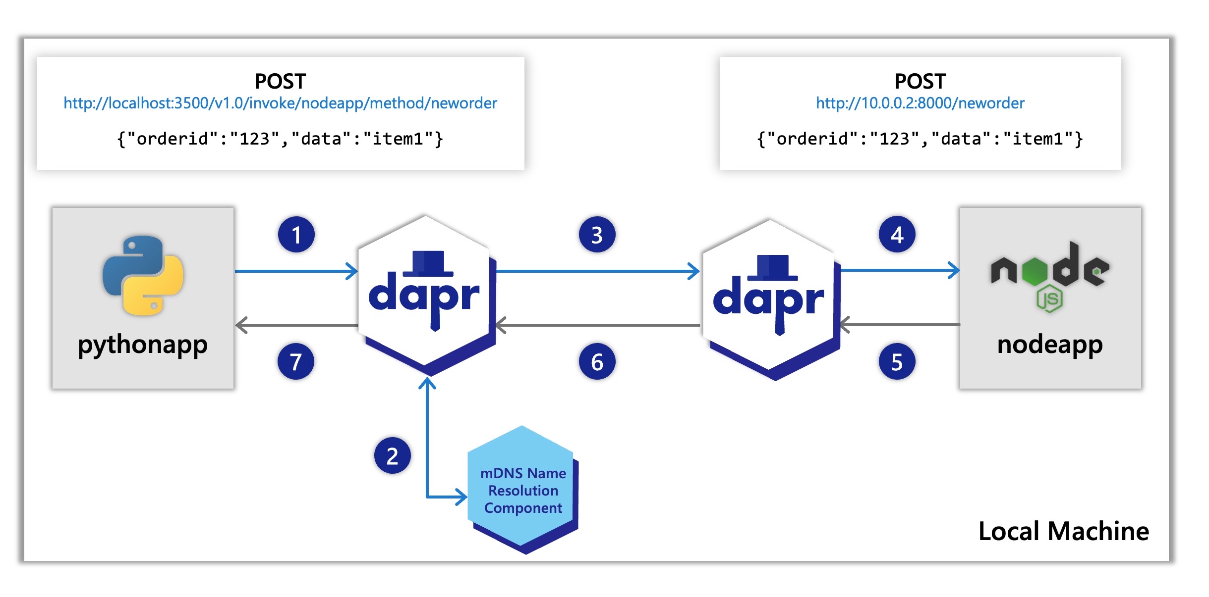 1. The Node.js app has a Dapr app ID of nodeapp. The python app invokes the Node.js app’s neworder method by POSTing http://localhost:3500/v1.0/invoke/nodeapp/method/neworder, which first goes to the python app’s local Dapr sidecar.